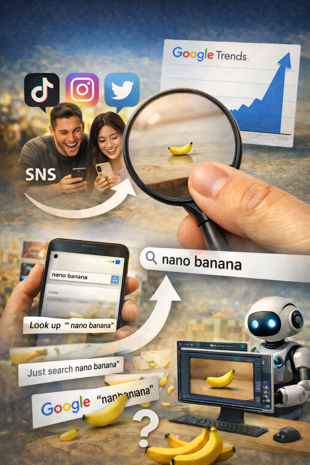 이 키워드는 ‘nano(극도로 작은)’ + ‘banana(바나나)’라는 단순한 조합에서 출발한 인터넷 유행어입니다.