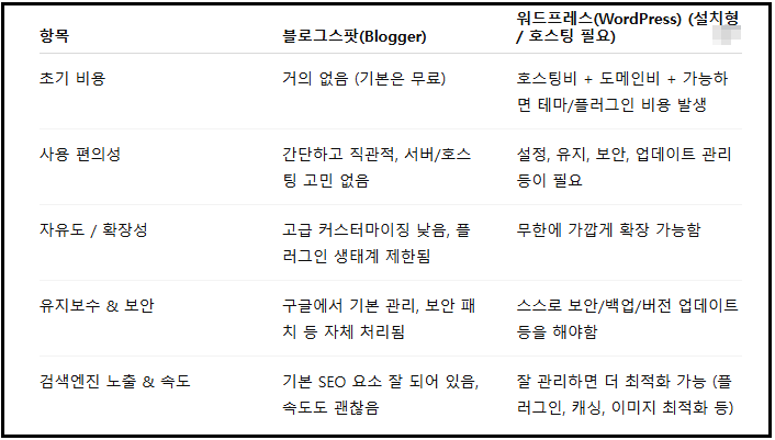 비교해 보면 블로그 시작 목적, 운영 규모, 기술 숙련도 등에 따라 어떤 플랫폼이 더 적합할지 차이가 생깁니다.