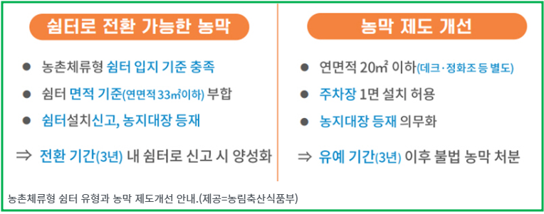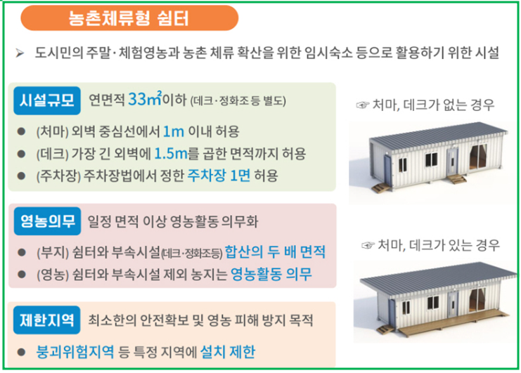 농촌체류형 쉼터 도입 배경에는 농막의 숙박 제한이 큰 영향을 미쳤습니다.