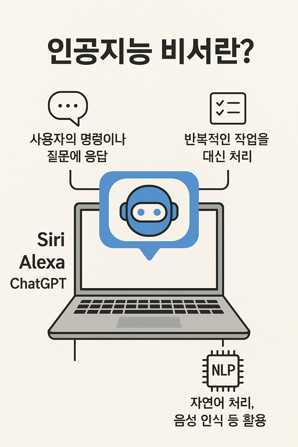 인공지능 비서(AI Assistant)는 사용자의 명령이나 질문에 응답하고, 반복적인 작업을 대신 처리해 주는 소프트웨어입니다.