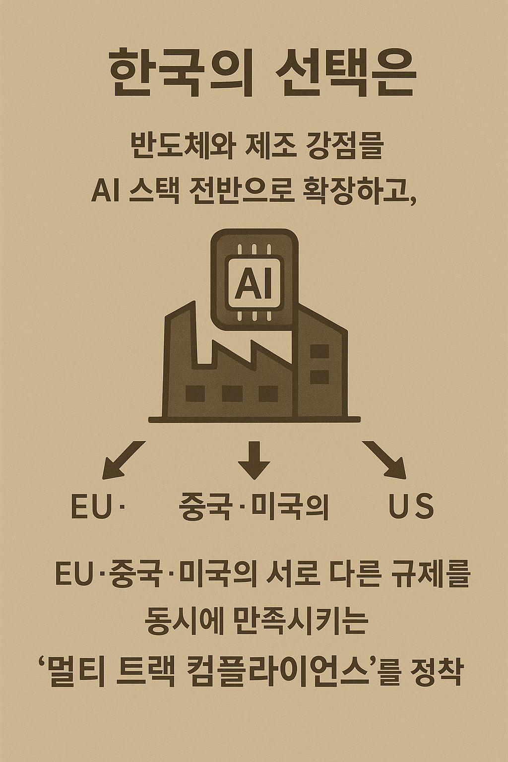 한국의 선택은 반도체와 제조 강점을 AI 스택 전반으로 확장하고, EU·중국·미국의 서로 다른 규제를 동시에 만족시키는 ‘멀티 트랙 컴플라이언스’를 정착시키는 것입니다.
