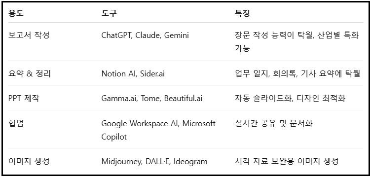 정형화된 업무 문서와 프레젠테이션은 AI 도구를 통해 빠르고 효율적으로 제작할 수 있으며, 핵심은 ‘적절한 툴의 선택’과 ‘프롬프트 전략’에 있습니다.