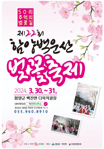 2024년 제22회 함양 백운산 벚꽃축제는 오는 3.30(토)부터 3.31(일)까지 이틀간 진행됩니다.