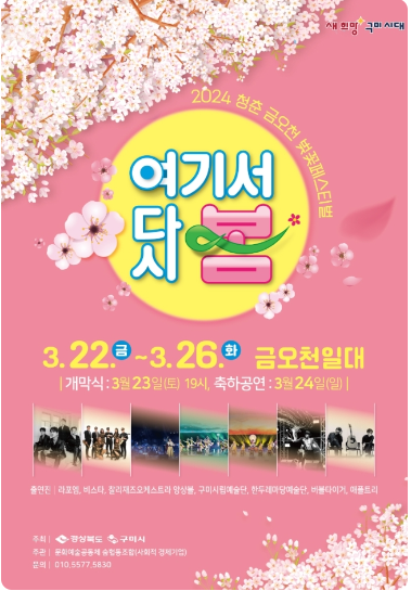 봄의 시작을 알리는 벚꽃 시즌, 구미시 금오천을 따라 다양한 경험이 가능한 거리예술축제가 개최됩니다.