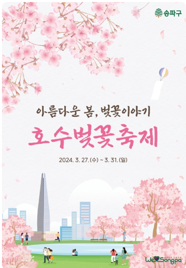 아름다운 봄, 벚꽃이야기 호수벚꽃축제는 송파구 석촌호수에 핀 벚꽃과 다채로운 공연을 함께 즐길 수 있는 축제입니다.
