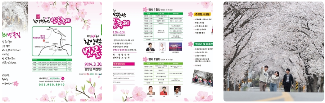 벚꽃축제가 열리는 장소는 함양 읍내에서 시작해서 병곡면 지나 백전면 백운마을까지 이어지는 50리 벚꽃길이며, 미스터트롯 손빈아, 나운하 등 초청가수 공연과 민속놀이 및 노래자랑 등 다양한 참여 프로그램이 마련되어 있습니다.