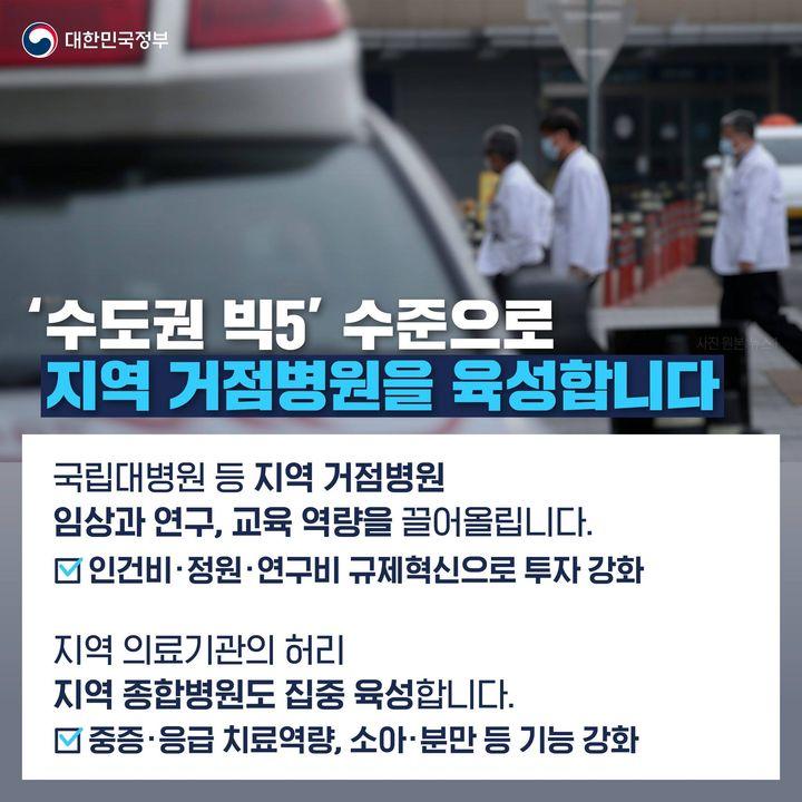정부는 언제, 어디서든, 어떤 질병이든 제때 치료받을 수 있는 지역완결적 의료체계를 구축하기 위한 노력을 진행하고 있습니다. 이를 위해 국립대병원 등을 포함한 지역 거점병원의 역량을 수도권 주요 5대 병원 수준으로 높이고, 중 진료권 단위별로 3~4개의 지역 종합병원을 육성하는 계획을 추진하고 있습니다. 이를 통해 지역 내에서 어떤 질환에도 최적의 의료 서비스를 받을 수 있는 체계를 구축하고자 합니다.