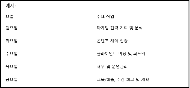 이런 방식은 월~금을 ‘업무 테마별’로 구분해, 반복적이고 루즈한 일정을 방지하고, 다양성과 리듬을 유지할 수 있게 해 줍니다.