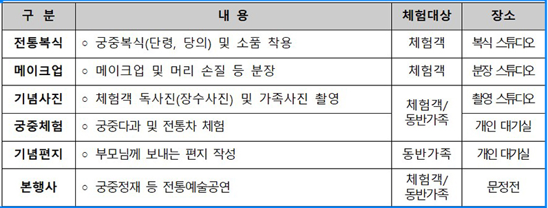 체험자는 고위 문·무관과 정경부인 등이 되어 조선 시대 전통 복식과 분장을 체험하고 가족과 함께 기념촬영을 한 뒤 궁중 병과를 맛보며 궁중 연향의 일부를 재현한 공연을 포함한 전통 예술 공연을 관람할 수 있습니다.