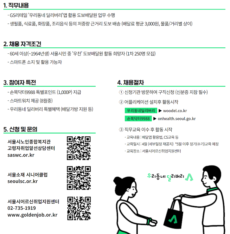 60세 이상 건강한 어르신 대상으로 250명을 우선 선발하고 향후 1000명까지 확대할 예정이며, GS리테일의 친환경 도보배달 플랫폼 ‘우리 동네 딜리버리 우친’ 앱을 통해 생필품·식료품·화장품·조리음식 등 주문을 접수받고 상품을 도보 이동해 배달하는 업무(1건당 배달료 2~4,000원)를 하게 됩니다.