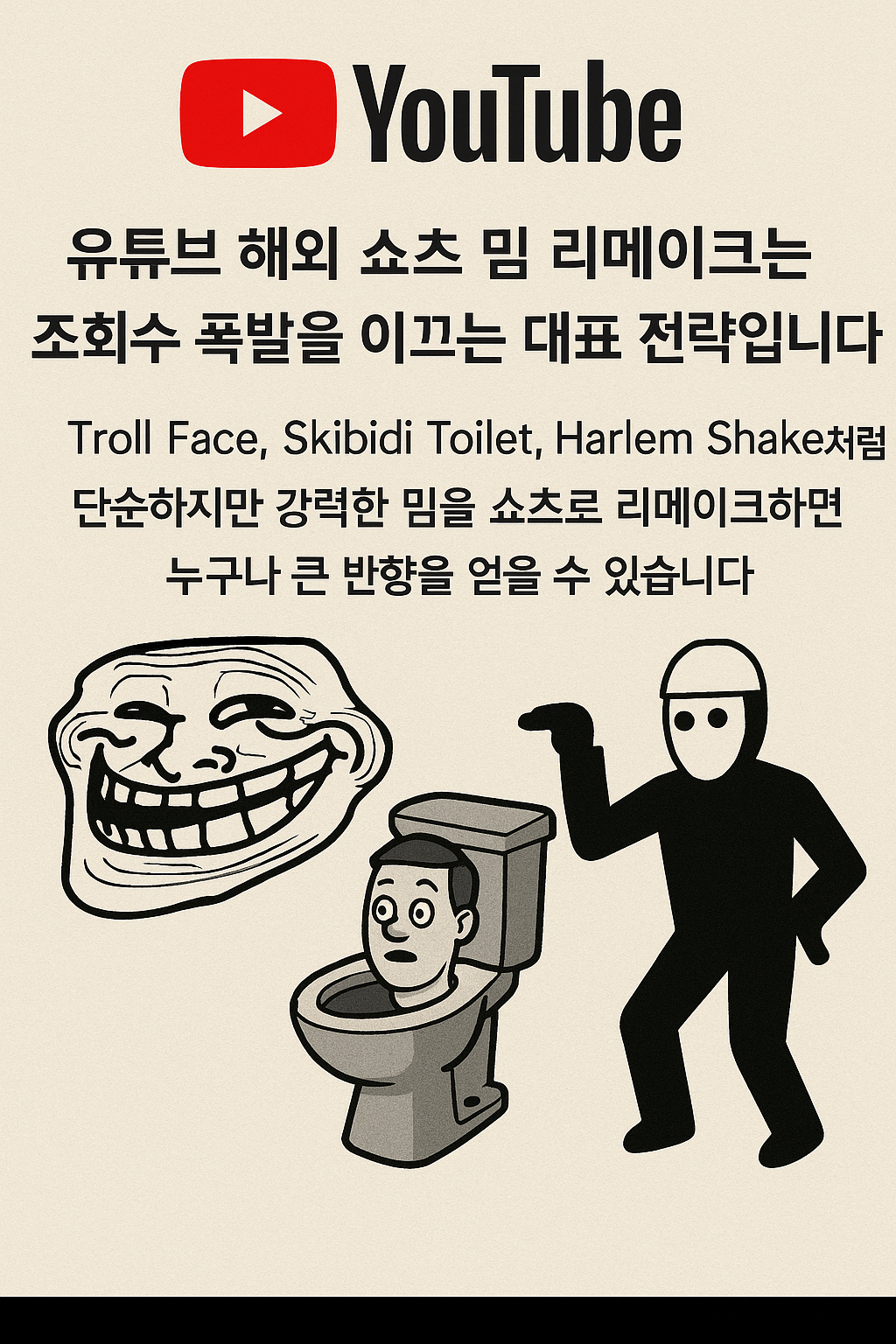 Troll Face, Skibidi Toilet, Harlem Shake처럼 단순하지만 강력한 밈을 쇼츠로 리메이크하면 누구나 큰 반향을 얻을 수 있습니다. 핵심은 빠른 트렌드 캐치, 간단한 구조, 그리고 차별화된 표현입니다. 앞으로도 밈 리메이크는 유튜브 쇼츠 생태계에서 중요한 역할을 하며, 크리에이터에게 무궁무진한 기회를 줄 것입니다.