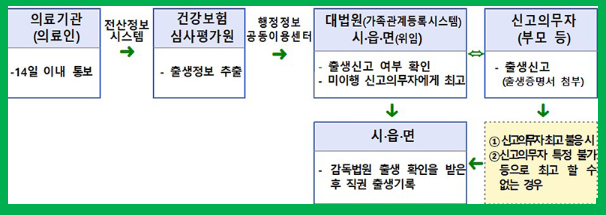 의료기관은 아동 출생 후 14일 이내에 출생 정보를 행정기관에 통보해야 하며, 이에 따라 시·읍·면장에게 출생 정보가 제공됩니다. 출생 정보가 신고되지 않을 경우에는 최고 통지가 발령되며, 신고가 이루어지지 않을 경우 시·읍·면장이 출생을 기록합니다.