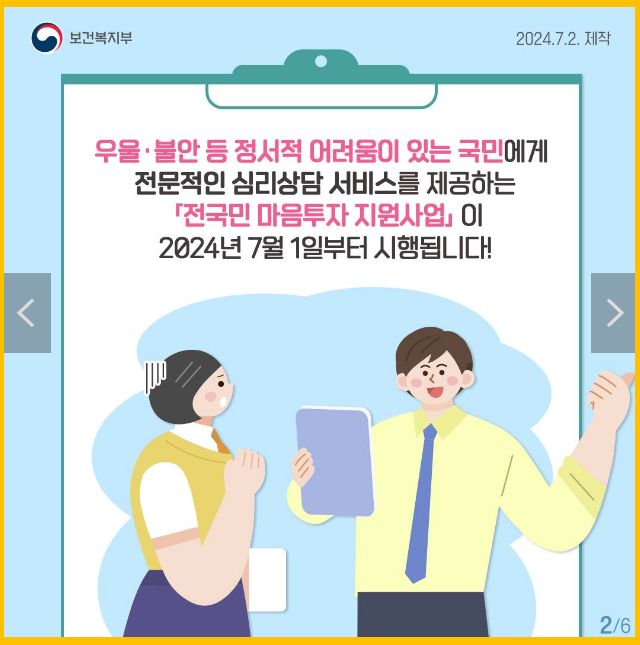 2024년 7월 1일부터 시작된 전 국민 마음투자 지원사업은 우울·불안 등 정서적 어려움을 겪는 국민에게 전문적인 심리상담 서비스를 제공하여 마음건강을 지키기 위한 중요한 발걸음을 내디뎠습니다.