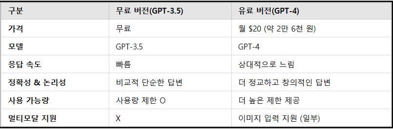 무료 버전(GPT-3.5)은 누구나 쉽게 접근할 수 있으며, 기본적인 질문과 답변에 적합합니다.