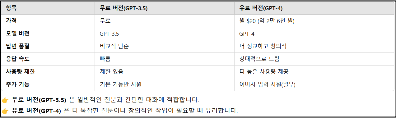 ✅ 무료 버전(GPT-3.5)과 유료 버전(GPT-4)의 차이를 이해하고 본인에게 맞는 버전을 선택하세요.