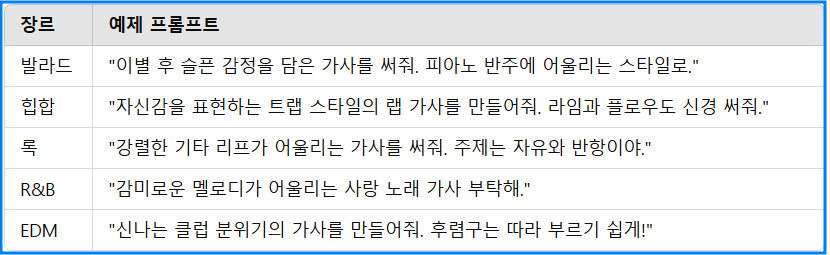 - 스타일 모방: 유명 가수 또는 특정 장르 스타일로 가사를 만들어줌