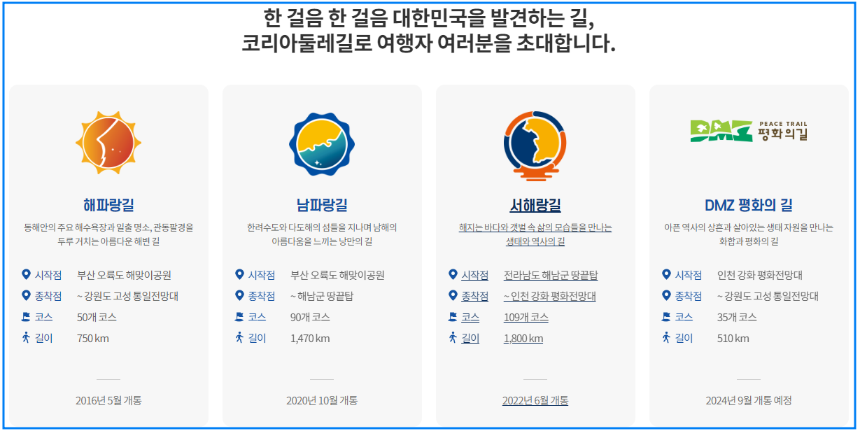 코리아둘레길은 동해의 해파랑길(2016년), 남해의 남파랑길(2020년), 서해의 서해랑길(2022년) 그리고 디엠지 평화의 길(2023년)로 구분되며, 각 구간마다 고유의 매력을 지니고 있어 국내외 관광객들에게 큰 관심을 받고 있습니다.