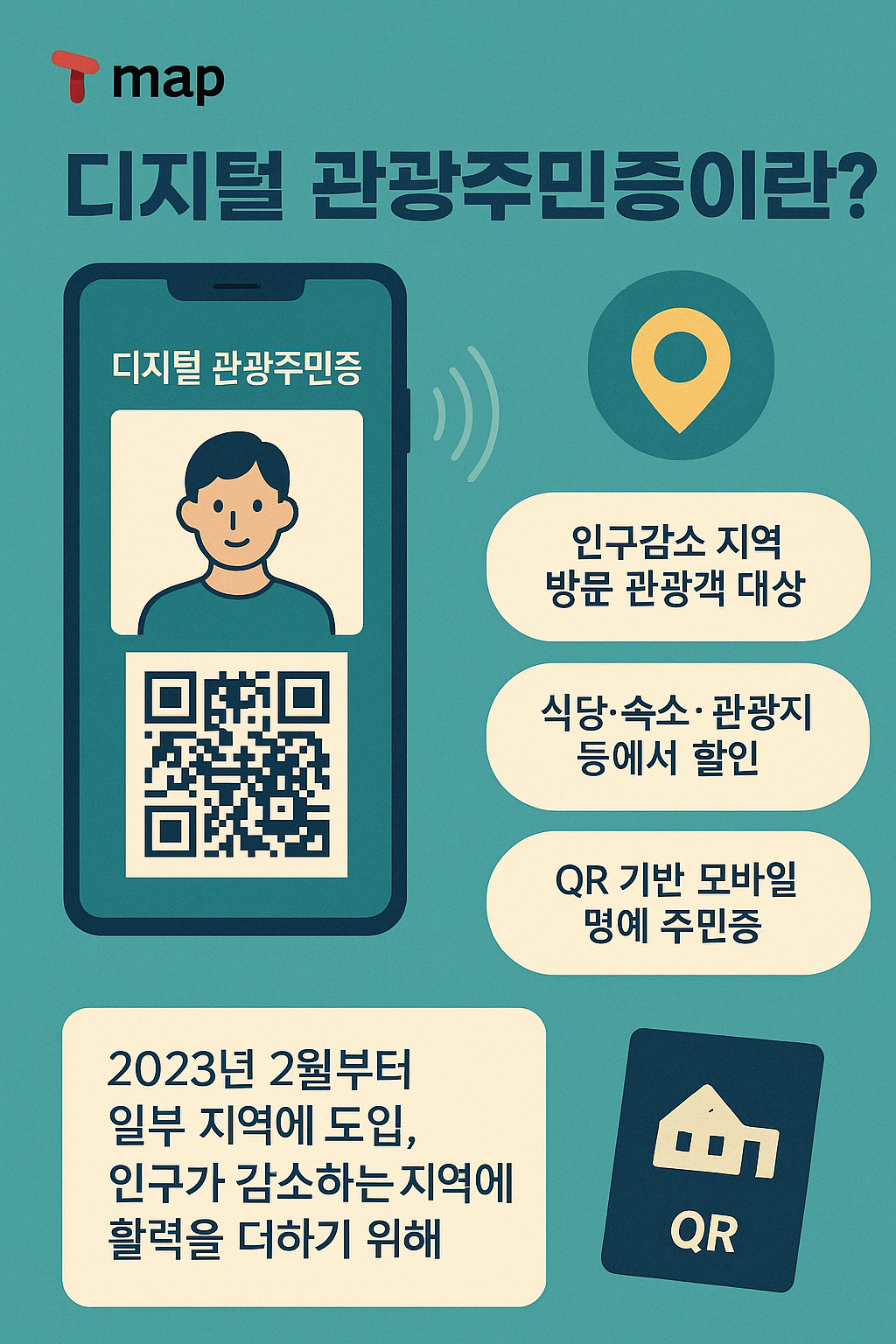 디지털 관광주민증은 인구감소 지역에 방문한 관광객에게 발급되는 디지털 명예 주민증으로, 관광객은 해당 지역의 식당, 숙소, 체험, 관광지 등에서 할인을 받을 수 있는 QR 기반 서비스입니다.