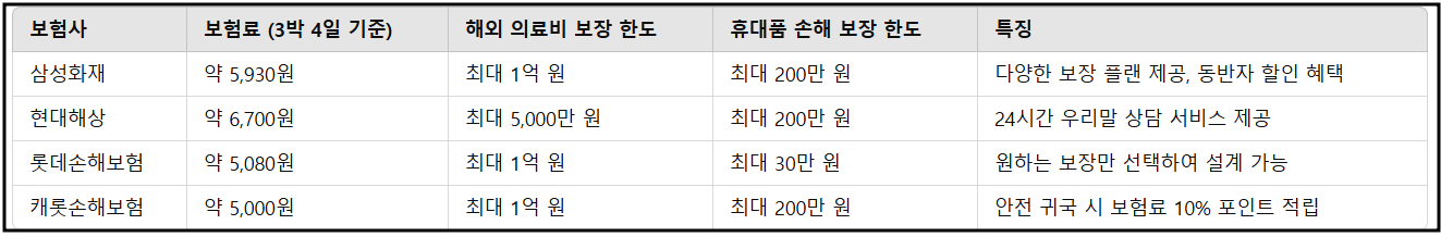 여러 보험사에서 다양한 해외여행자보험 상품을 제공하고 있습니다. 아래는 주요 보험사의 상품을 비교한 표입니다.