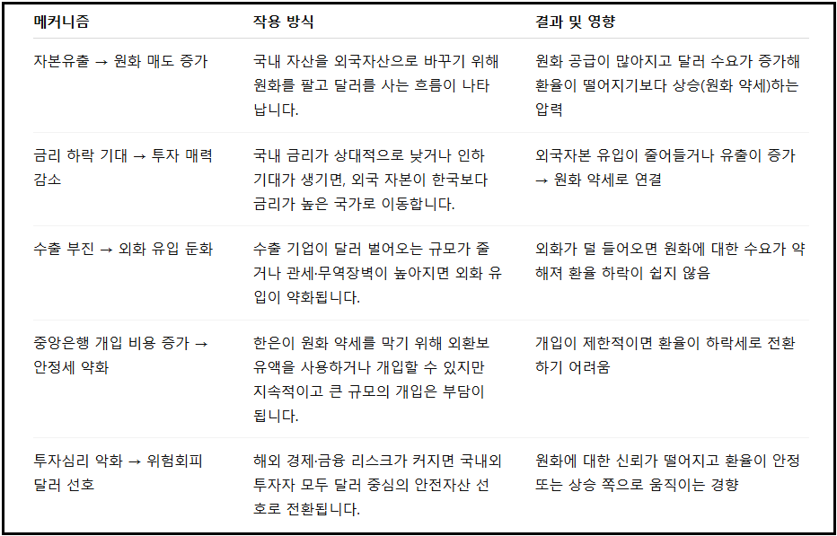 특히 키워드 ‘금리차’, ‘자본유출’, ‘수출둔화’가 현재 한국 환율 환경을 잘 설명해 줍니다.