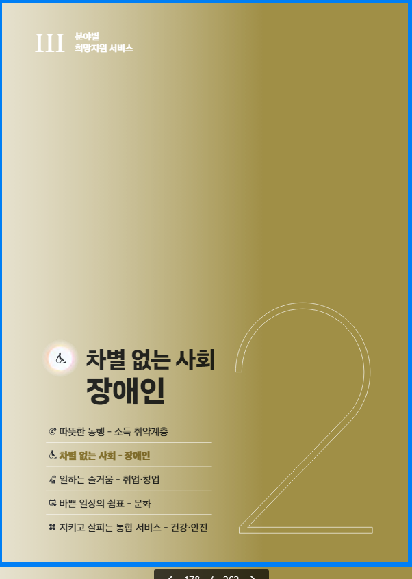 - 분야별(복지·일자리·문화·건강·안전.주거) 지원 정책 등 수록