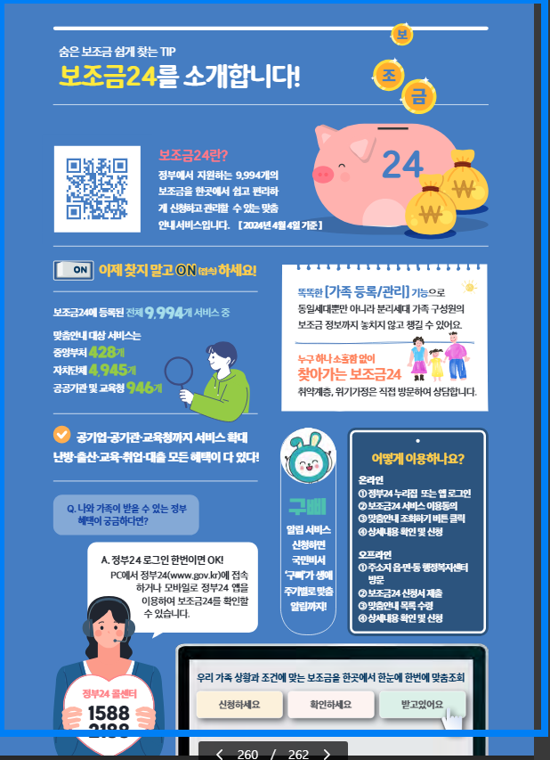 또한, 해당하는 각각의 정책을 바로바로 찾아 접속이 가능하도록 QR코드를 넣고 바로 신청할 수 있도록 편리성을 높이고 ‘2024 신규 민생지원 제도’와 ‘숨은 정부 지원금 찾기’ 등 별책 부록으로 구성했습니다.