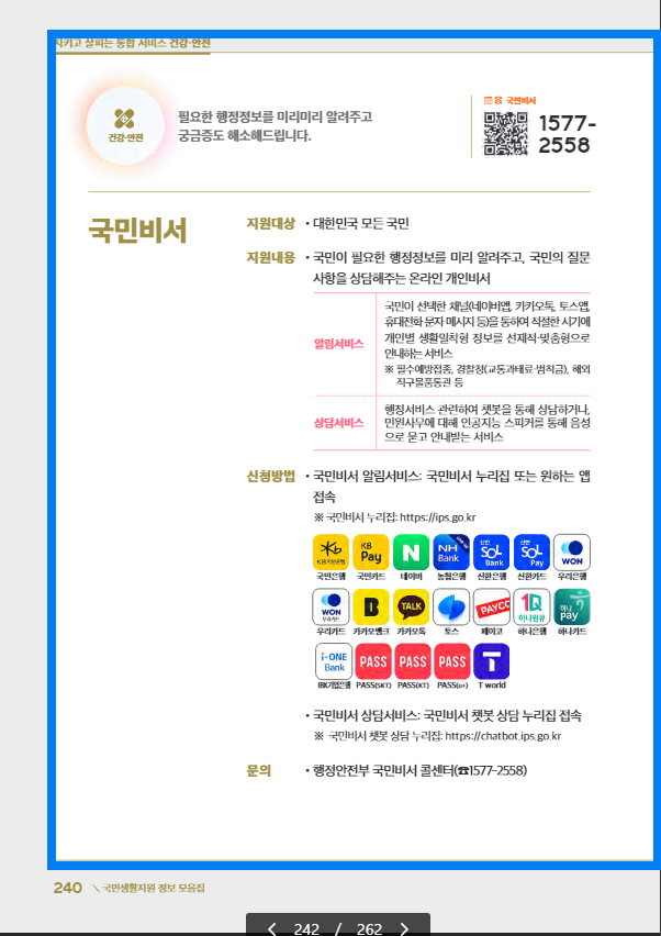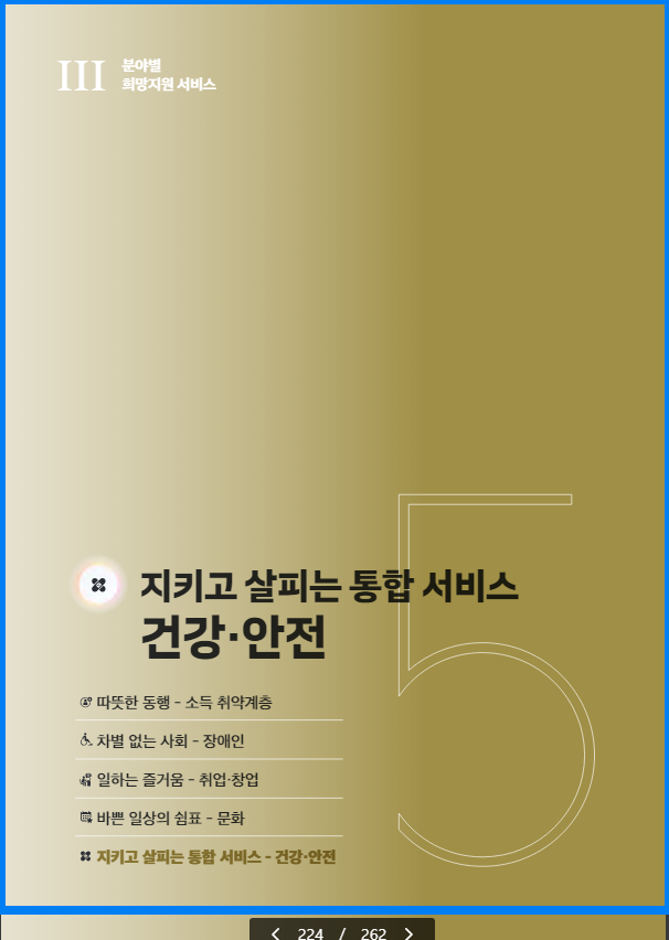 그 외 문화서비스와 건강.안전에 관한 통합 서비스 등 국민부담은 낮추고 복지수준을 높이는 다양한 제도들을 담아 한 곳에서 쉽게 찾아볼 수 있도록 담았습니다.