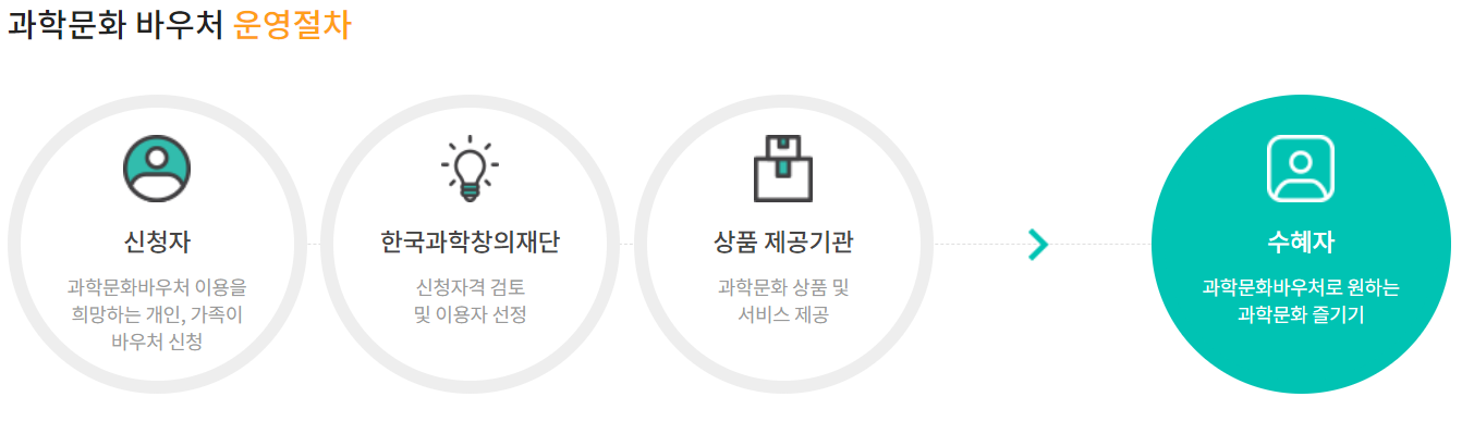 과학문화 바우처 홈페이지에서 온라인으로만 신청 가능하며 이용자 선정은 기존의 과학문화바우처를 이용해 본 적이 없는 분들을 우선 선발하므로 처음 신청하시는 분들이 유리합니다.