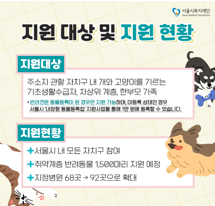 서울시가 취약계층 반려인들의 부담을 조금이나마 덜어줄 수 있는 이번 지원 사업이 많은 분들에게 도움이 되길 바랍니다.