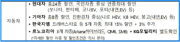 현대차는 지난해보다 할인 차종을 24종으로 확대하여 쏘나타, 산타페 등 국민차종에 최대 200만 원까지 할인을 제공하며, 전기차 포터 EV와 코나 EV는 각각 최대 500만 원과 400만 원 할인 혜택을 제공합니다.