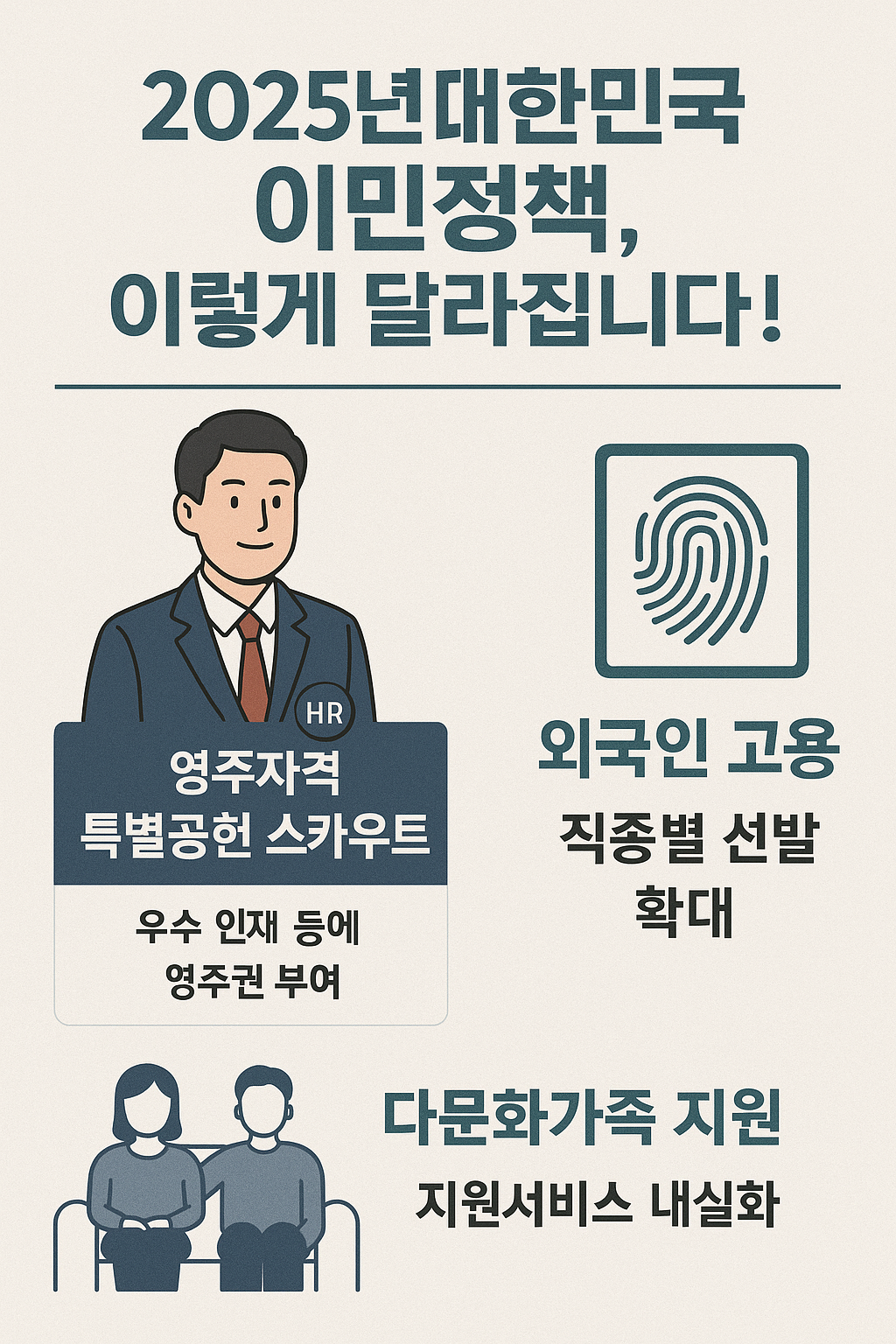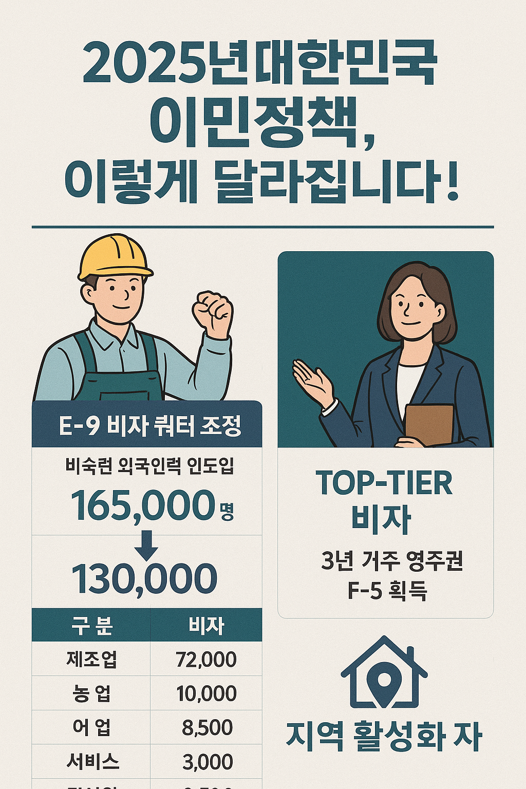 2025년 대한민국 이민정책 변화가 상세히 드러납니다. 핵심 키워드 “2025년 이민정책”, “톱티어 비자”, “지역특화형 비자” 가 포함되어 있으며, E‑9 쿼타 조정, 영주권 취득 조건 완화, 지역 비자 확대 등 주요 정책을 누구나 이해하기 쉽게 정리해 드립니다.