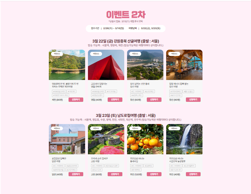 여행 코스: 전라, 충청, 강원, 충북 등 총 24개의 다양한 여행 코스가 포함되어 있으며, 17일까지 신청받는 태안에서의 향토 음식 체험, 신두리 해안사구 맨발 걷기, 허브농원 족욕 등 각 지역의 특색 있는 체험을 즐길 수 있습니다.