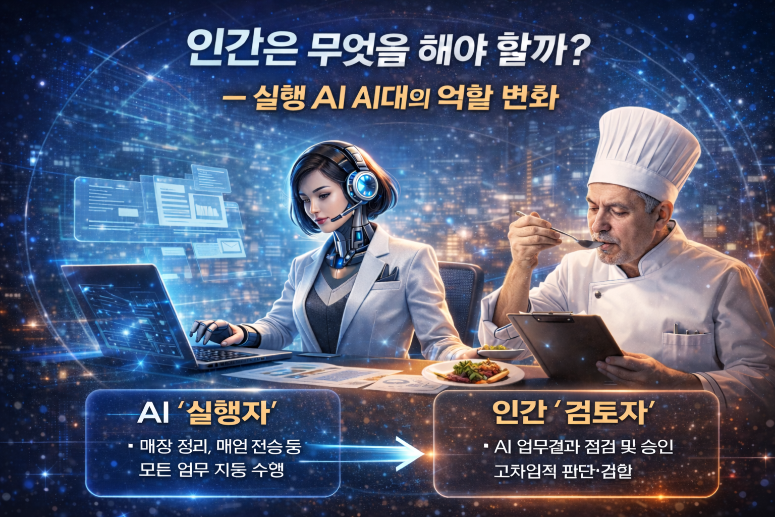 A. 인간의 역할은 직접 실행자에서 검토자·최종 결정자로 이동하게 됩니다. AI가 실행한 결과물을 평가하고 승인하는 ‘총괄 셰프’ 같은 안목이 더욱 중요해집니다.