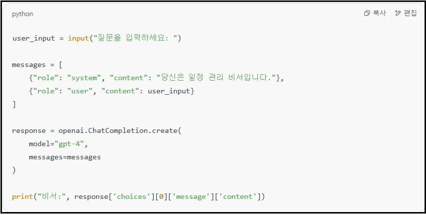 이제 텍스트 기반 AI 비서를 손쉽게 만들 수 있으며, 이를 다양한 도구와 연동하면 강력한 업무 자동화 도구로 확장할 수 있습니다. 다음 편에서는 이 비서에 음성 인식 기능(Whisper API)을 추가해, 말로 명령하는 스마트 비서를 만드는 방법을 소개하겠습니다.