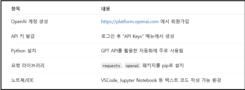 GPT API를 사용하기 위해서는 다음과 같은 준비가 필요합니다.