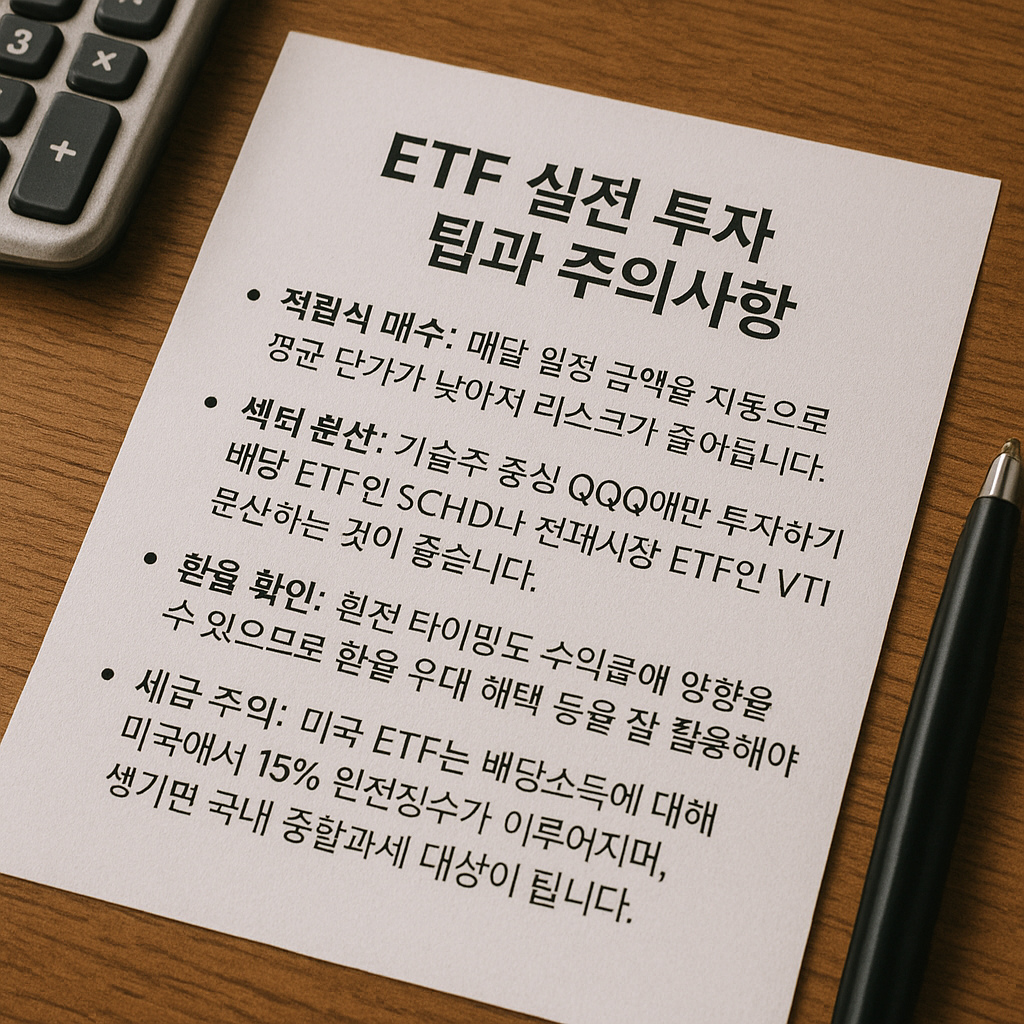 - 세금 주의: 미국 ETF는 배당소득에 대해 미국에서 15% 원천징수가 이루어지며, 연 2000만원 이상 해외주식 소득이 생기면 국내 종합과세 대상이 됩니다.