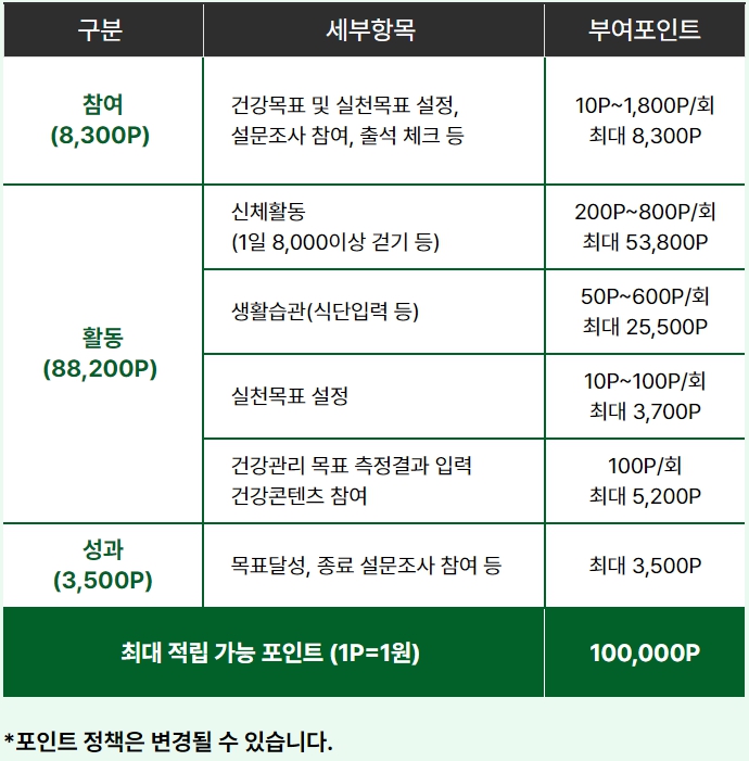 '손목닥터 9988' 참여자는 하루 8천보 이상 걸으면 200포인트, 건강퀴즈 참여 시 100포인트 등 활동 참여에 따라 1인당 최대 10만 포인트를 받을 수 있습니다.
