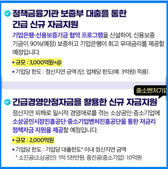 정부는 중소기업과 소상공인에게 5,600억 원 +α 규모의 유동성을 지원하기로 했습니다. 긴급경영안정자금 2,000억 원과 신보·기은 협약 프로그램 3,000억 원 등을 통해 피해 기업들의 자금난을 해소할 계획입니다.